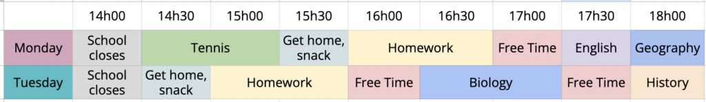 Make your weekly study schedule right at the beginning of the first term, as soon as you have your class timetable and extra-murals. Start with when school comes out, and divide your day into 30-minute blocks, let’s say from 14h00 to 20h00. First, schedule in meals, like lunch and dinner. Next, fill in your extramurals and time for any chores you have at home. Then, divide your subjects up so that you have at least an hour per week to summarise each. As you have more learning subjects than days in the week (excluding weekends), you will need to summarise two subjects per day on at least 3 days of the week. Decide which schoolday is most demanding, then schedule your easiest subject for that afternoon.